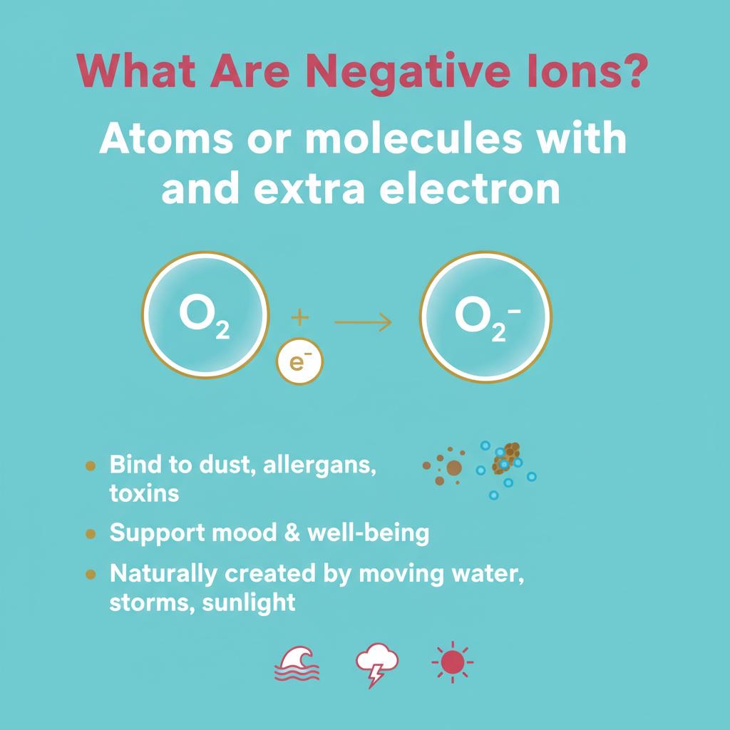 Negative ions are nature’s own purifiers. Scientifically, they’ve been shown to neutralize bacteria at the cellular level, improve air and water quality, and support circulation, oxygenation, and lymphatic flow. Holistically, they restore energy, balance, and clarity—the reason you feel so alive after being in nature.